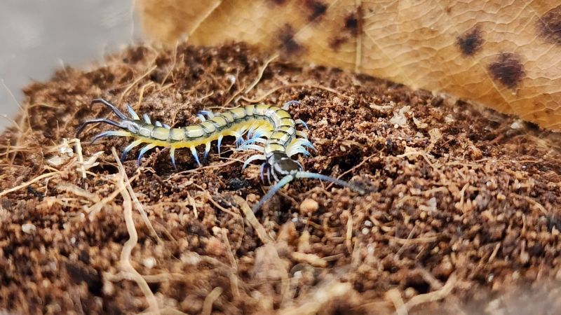 緑色のムカデは珍しく、幼体時は黄色と青色のとても綺麗な発色をしています。このカラーを楽しめるのは赤ちゃんの今だけ、、、