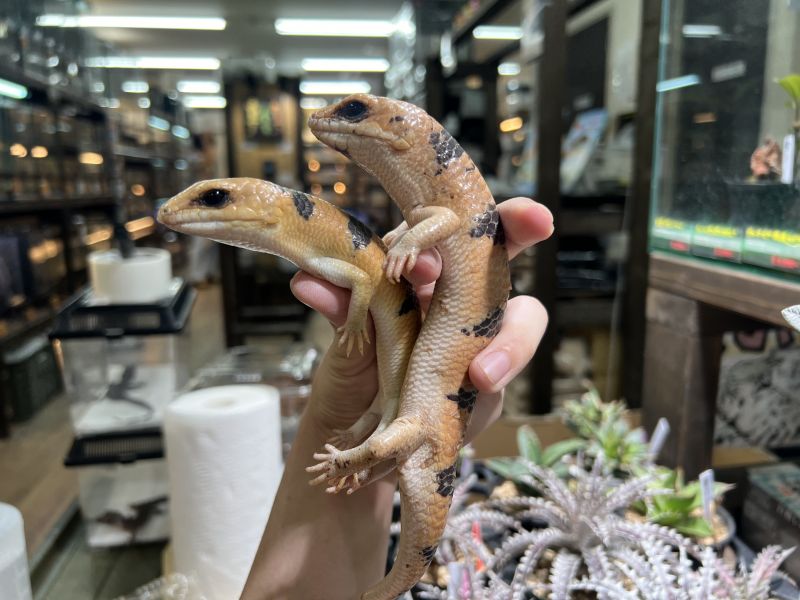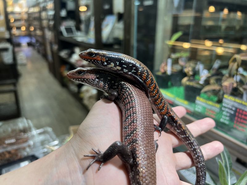 別名ファイアスキンク・ベニトカゲといった名前の通り、顔や脇腹にかけての赤い模様がとても美しい半地中性のスキンク。幼体時はしっぽが青くとても綺麗ですが生体になるにつれて褐色になっていきます。今回入荷個体にも1匹だけまだ青い子がいるので、気になる方はその子は野生採集の中でも若い個体なのでおすすめです!
