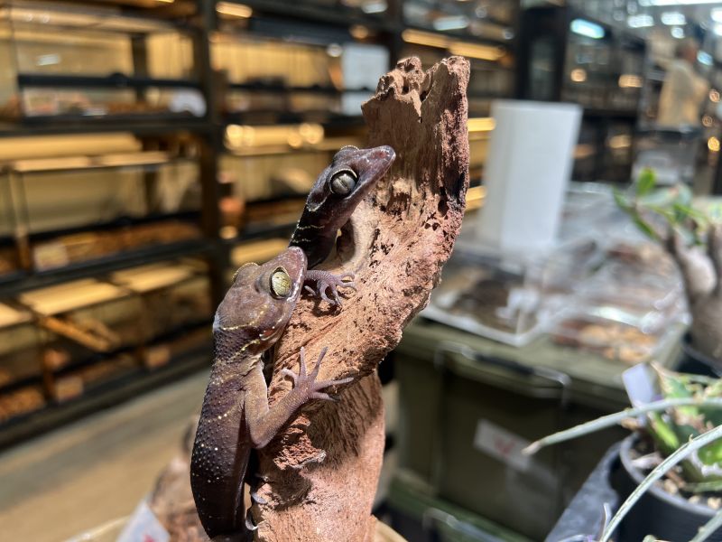 壁に張り付くのではなく木に掴まっており基本姿勢が逆さまで下を通った餌を食べるといった変わった特徴を持っている目が大きくバンド模様が綺麗なヤモリ。