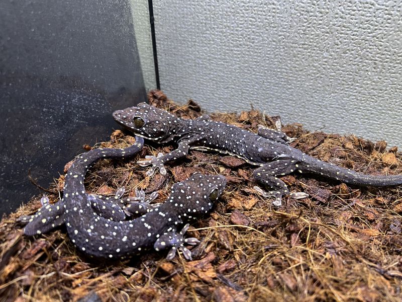 黒地に散りばめられた輝く星のような白い斑点模様がとても美しい大型のヤモリです。